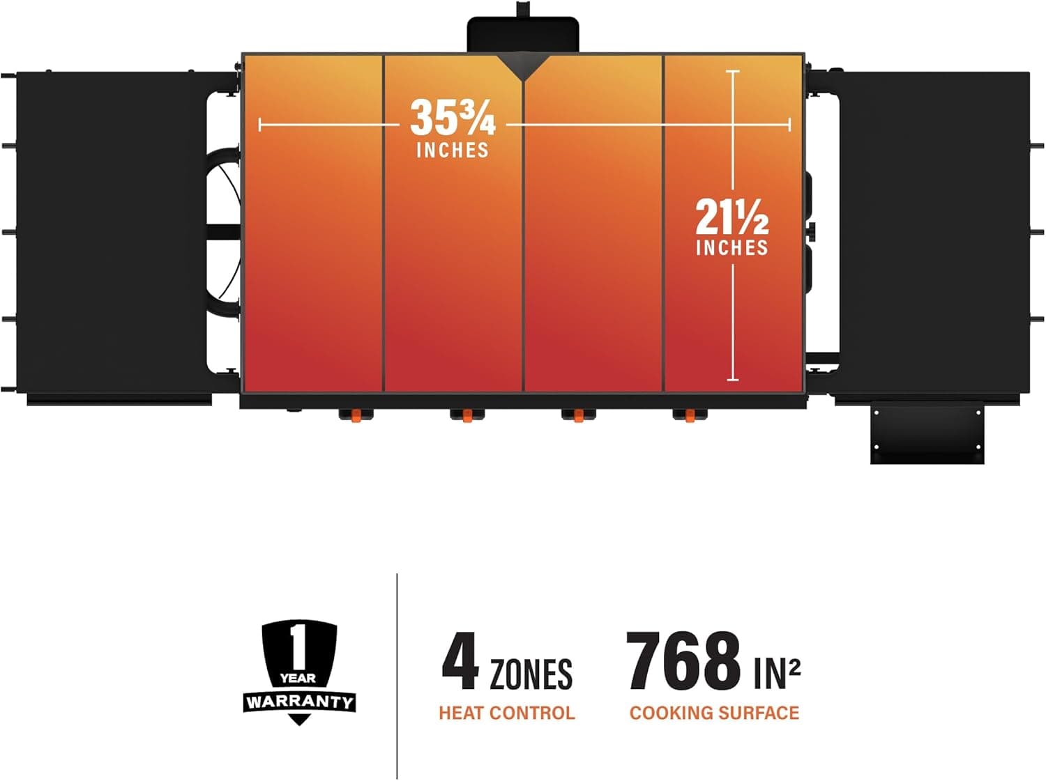 Amp up your outdoor kitchen with this Iron Forged 36” Griddle with X-Braced Hood. This powerful griddle is built with the Omnivore Griddle Plate which includes built-in wind guards and was designed to recover faster, prevent warping, and use less fuel to maintain high heat. With four independently heated cooking zones and 768 square inches of cooking space, this griddle is perfect for cooking for a crowd. Dual side shelves with one extendable side shelf and side shelf tool hooks provide plenty of room for meal prep and serving on your griddle. The side shelf bar system allows for customization so there is room for you to experiment, innovate, and construct your perfect cooking station. Enjoy the included bar system accessory bin and add other compatible Blackstone bar system accessories, sold separately, to your bar system to customize it to fit your needs. After cooking, cover your griddle top with the x-braced hood, fold down the side shelves, and wheel it to a convenient storage location. Enhance your outdoor cooking experience with this Iron Forged 36” Griddle with X-Braced Hood.