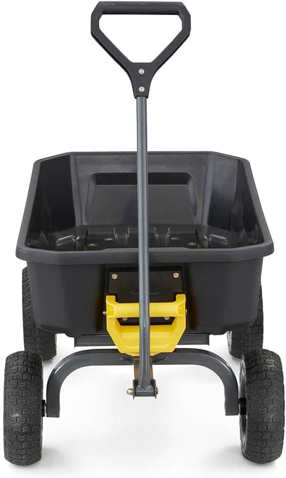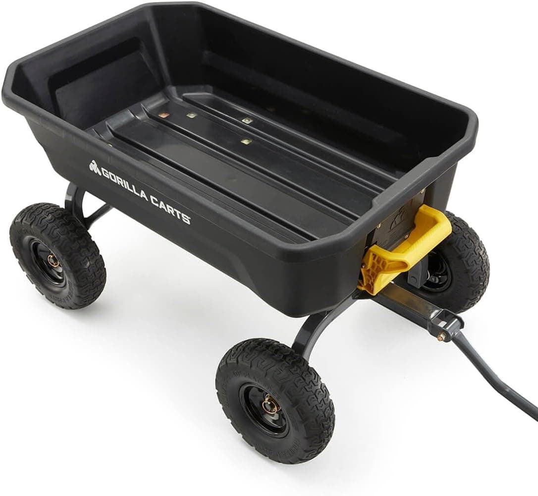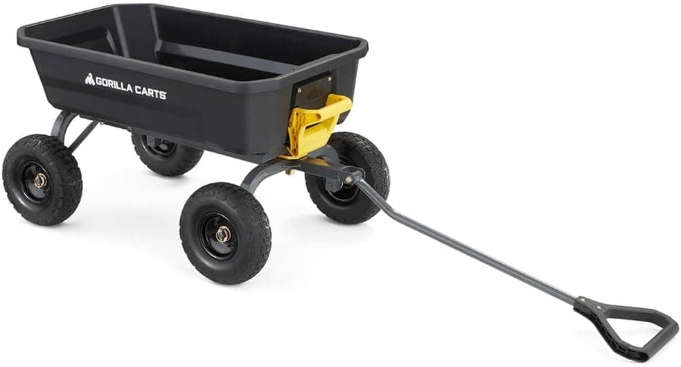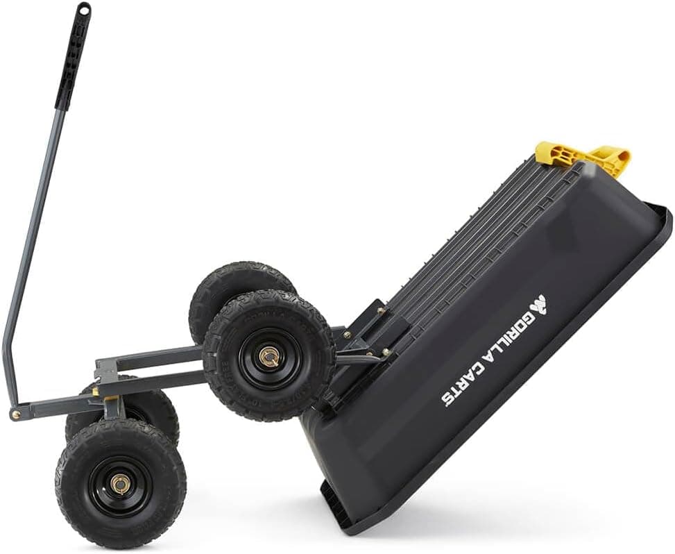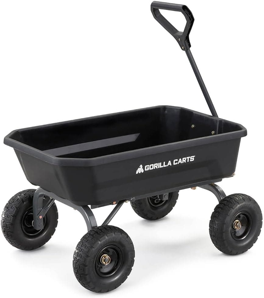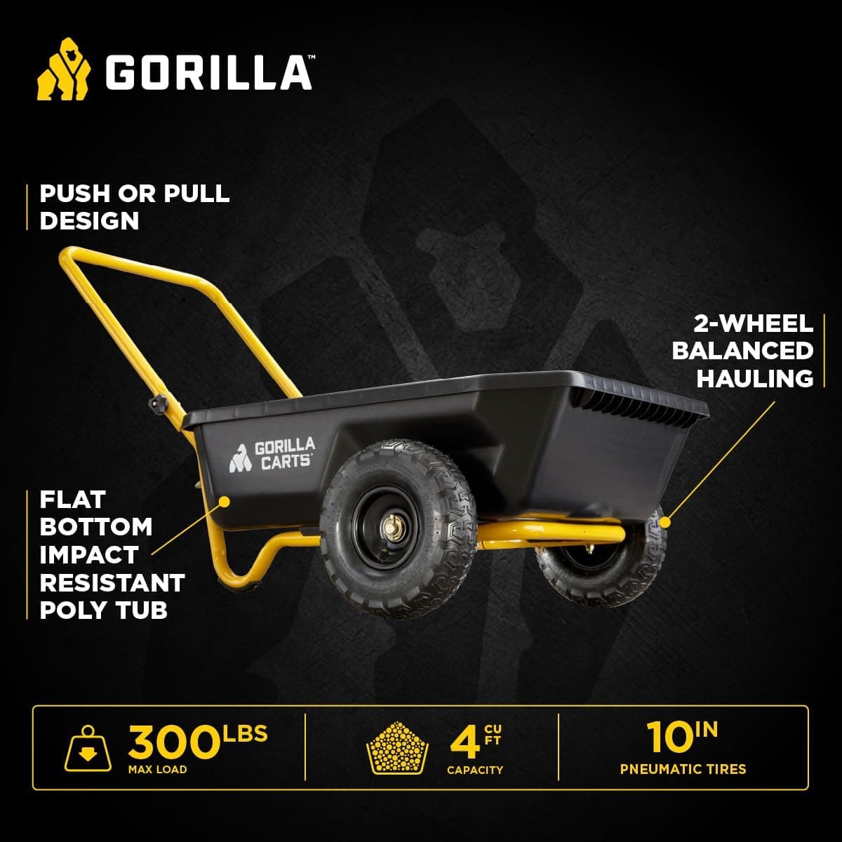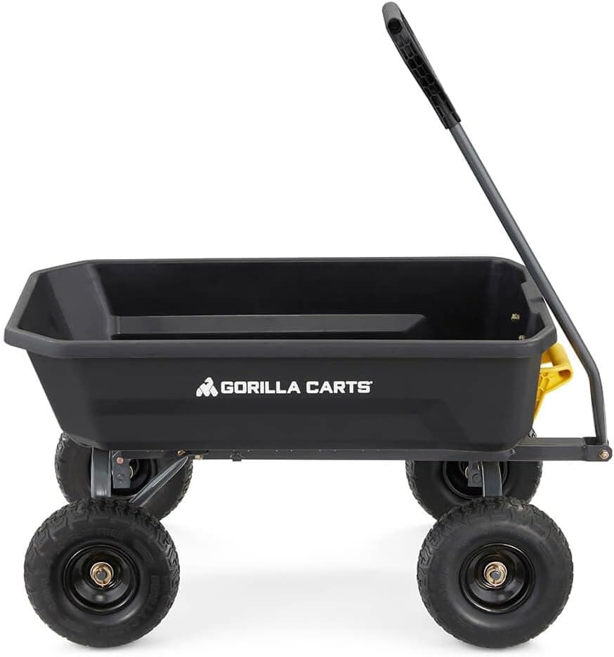 The all-new Gorilla Carts 4 cu. ft. Poly Garden Dump Cart is the perfect companion for all your outdoor projects - and you'll never have to worry about a flat tire! The innovative, updated frame design makes it quick and easy to assemble and has a wider stance offering more stability as well as zero-turn steering for improved mobility. Heavy-duty 10 in. no-flat foam-filled tires will tackle tough jobs on any terrain, and the high-strength poly bed with a 4 cu. ft. capacity lets you haul more with each load, finishing the job faster and more efficiently. Perfect for DIY, gardening, and farming. The all-new patented “roll-over” dump design allows the bed to tilt into an upended position with ease while keeping the cart balanced to prevent tipping. The Gorilla Carts 4 Cu. Ft. Poly Dump Hauling Cart comes with a 1-year limited warranty. Gorilla Carts' full line of products meets the needs of the light-duty homeowner as well as the commercial-duty professional user by offering carts in a wide variety of sizes and weight capacities.