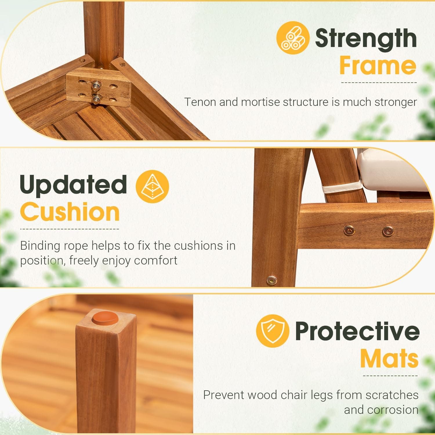 • Sturdy & Stylish Acacia Wood Frame: Crafted from high-quality acacia wood, the entire framework of this outdoor dining set exudes both robustness and elegance. The solid construction ensures stability and durability, while the sleek design complements any outdoor setting with modern flair.