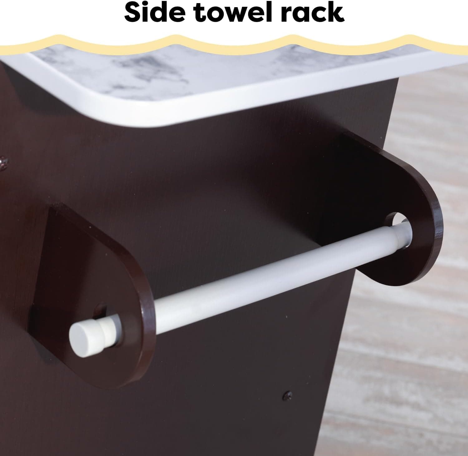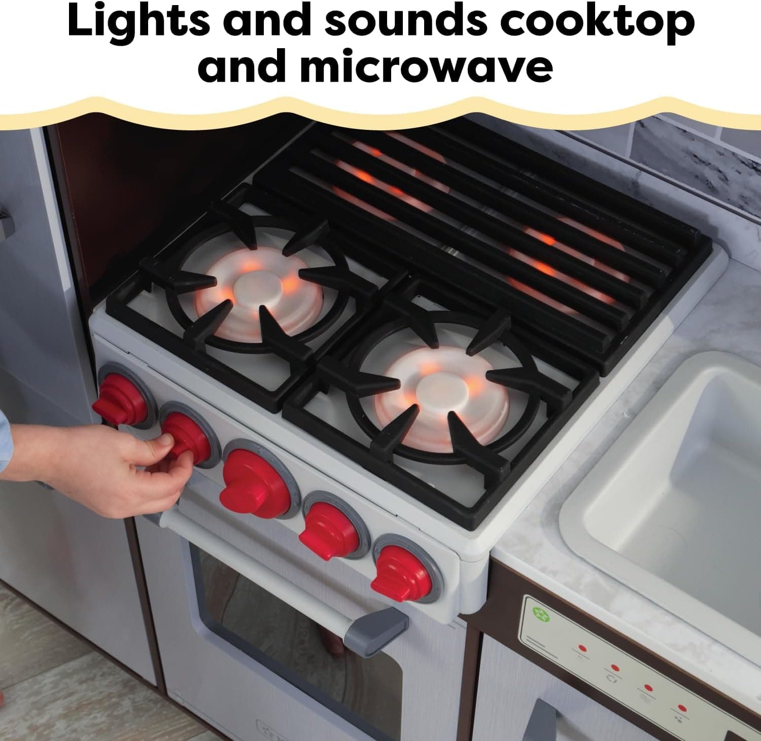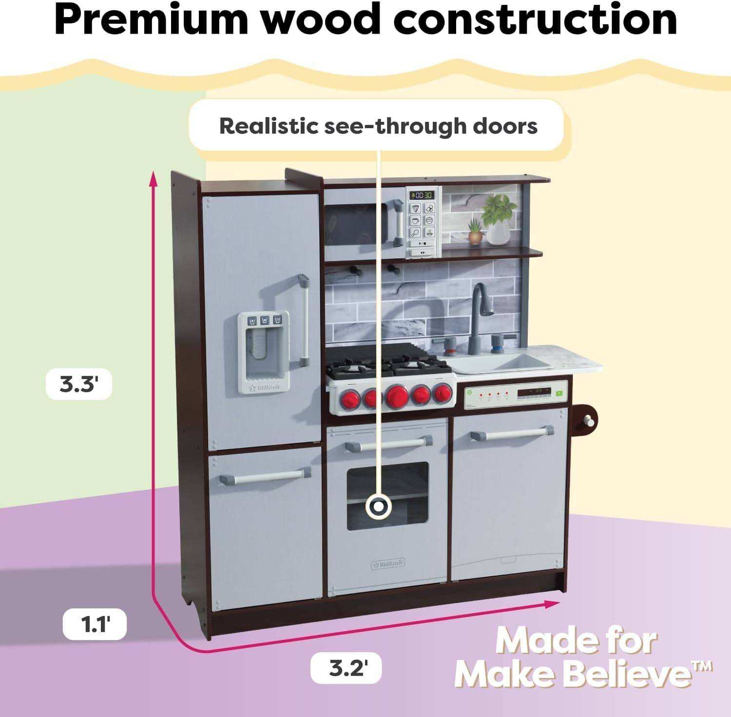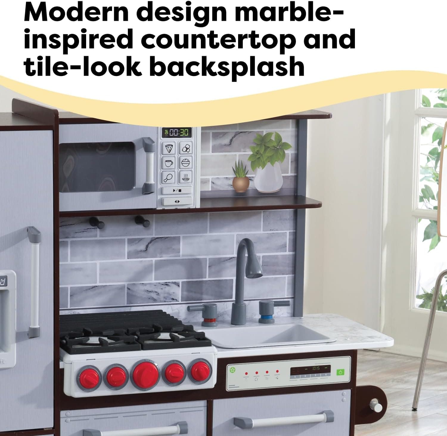 The ultra-modern and innovative KidKraft Uptown Espresso Play Kitchen creates hours of sizzlin’ fun for aspiring little chefs! Featuring beautiful dark wood details and marble-inspired countertops, this sleek kitchen offers up features that'll keep kids engaged. Children can pretend to boil, sauté and simmer delicious imaginative meals with the cooktop featuring lights and sounds. The microwave buttons also have sounds when pressed. Refreshing beverages are more fun to make with the working ice maker that dispenses plastic ice cubes. After cooking, kids can learn practical skills as they rinse off dishes in the sink using the faucet’s red and blue labels to indicate hot and cold water. Dishes can then be neatly stacked in the spacious dishwasher. A large refrigerator, a deep freezer and ample shelf space teach children how to organize pots, pans and play food. Innovative EZ Kraft Assembly™ technology speeds up assembly time, which means less build time and more play time!