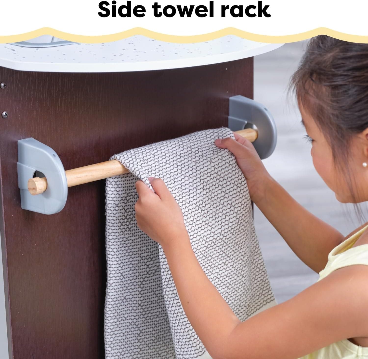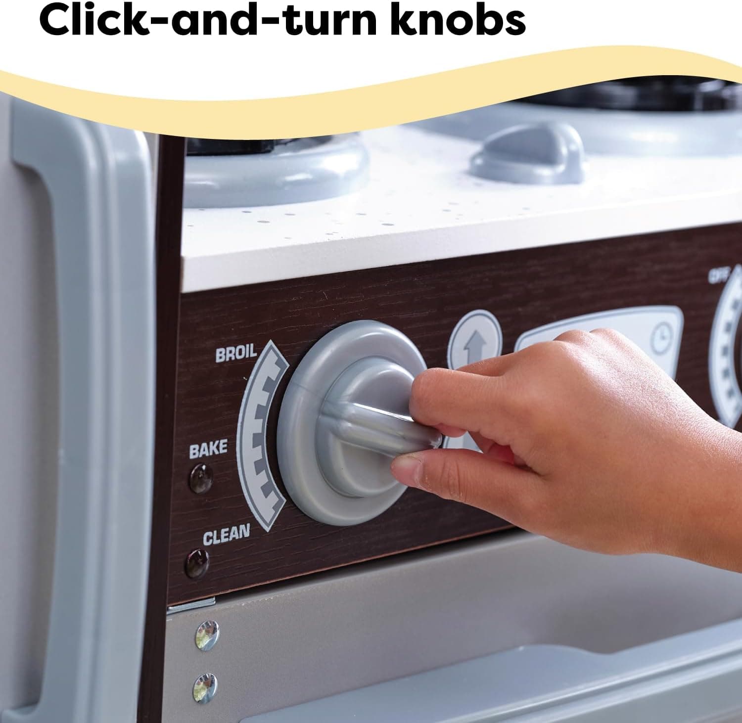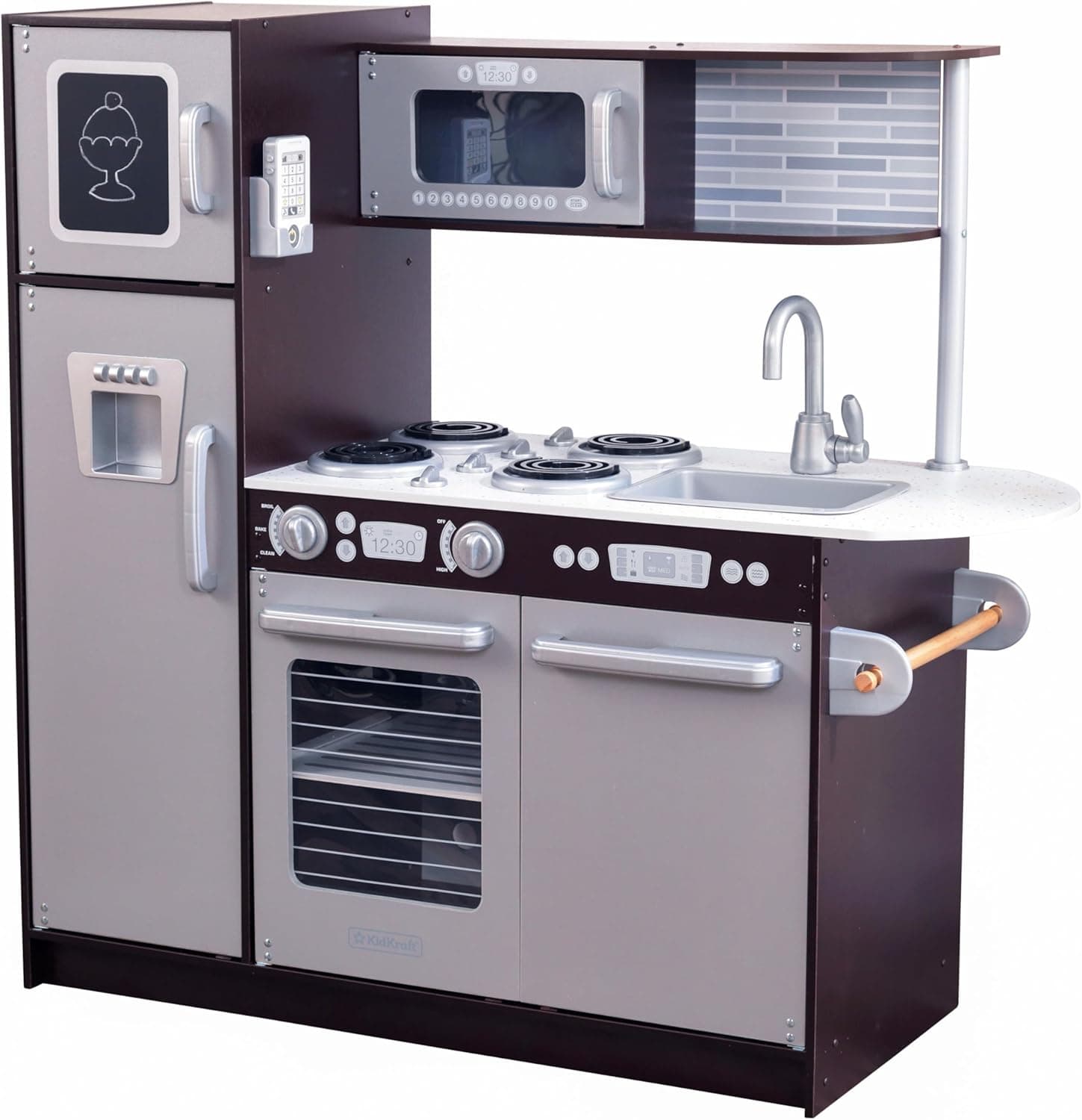 Product Description Time to cook up a little fun! Our KidKraft Uptown Espresso Play Kitchen has a hip, modern look that young chefs are sure to love. With tile-look backsplash and sleek countertops, the design is emulated from trendy real-life kitchens. Every appliance is interactive, including doors that open and close, knobs that turn and click and a working chalkboard on the freezer door. Kids will love taking calls on the cordless play phone that attaches to the side of the refrigerator. Keep all accessories neat and handy with the pegs for hanging utensils and the side towel rack. Crafted from composite wood, the Uptown Espresso contemporary kitchen is a sturdy and stylish addition to playtime. From the Manufacturer Time to cook up a little fun. Our Uptown Espresso Kitchen has a hip, modern look that young chefs are sure to love. This wooden kitchen is full of fun details like a cordless phone and a chalkboard for writing the daily specials.