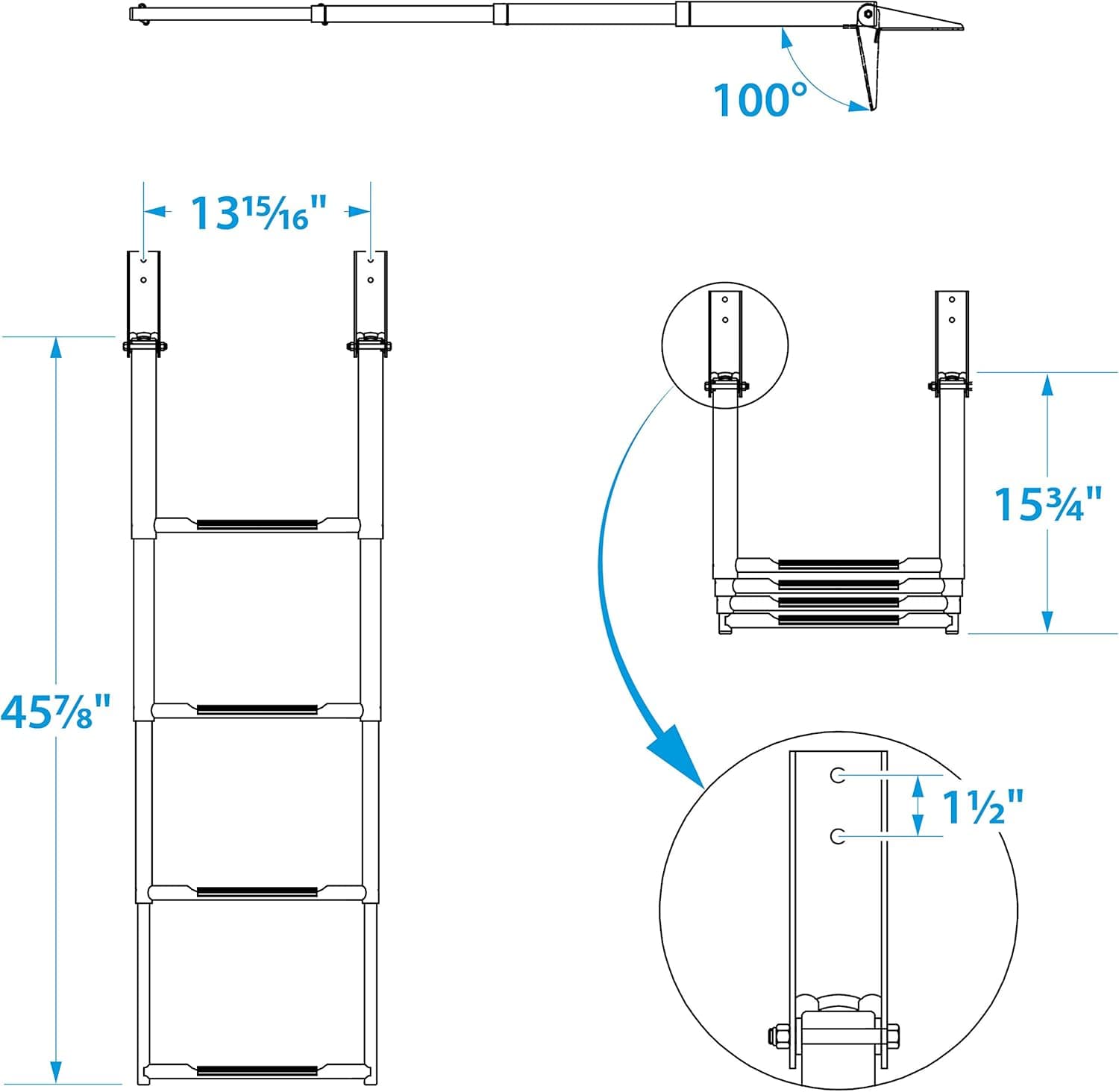 • Ladder overall width is 12 inches; step tread measures 7-1/4 x 1-1/2 inches; deployed length is 21-1/2 inches; stowed length is 13-1/2 inches
