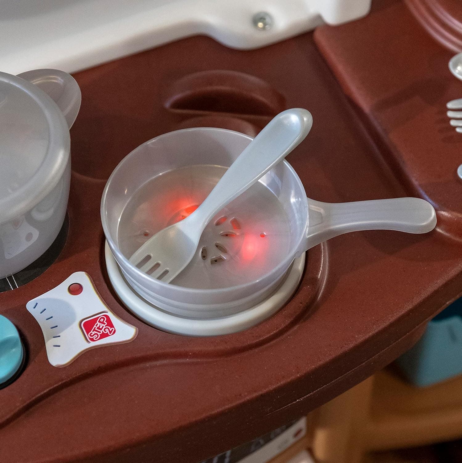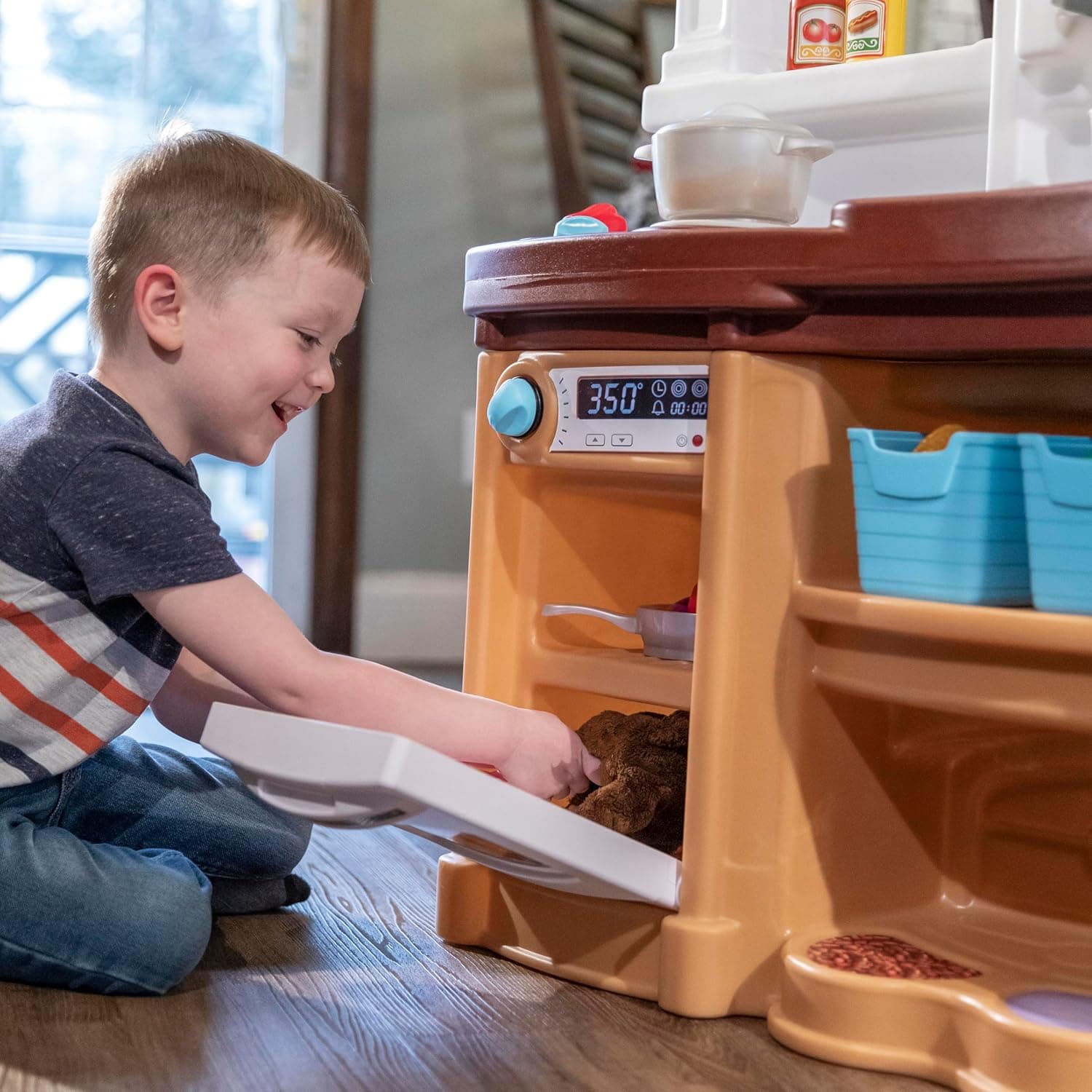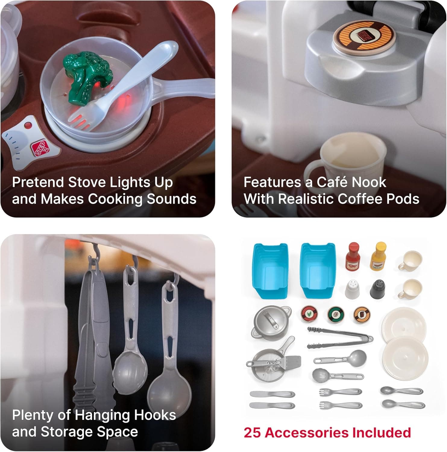 The Ultimate Play Kitchen! With our realistic molded-in sink with faucet, countertop, refrigerator, pod coffee machine, and oven with functional doors, your child's curiosity and inventiveness will be stimulated. This interactive playset is intended to encourage role play, and social skills development, and to assist your child in making sense of real-life circumstances. The 25-piece accessory package opens users to limitless opportunities for creative cooking activities. This set, which includes pots, pans, utensils, a coffee pot, and other accessories, brings fun to life. The electric stove burner even lights up and generates cooking sounds, offering a realistic experience that takes two "AA" batteries (not included). In addition, the knobs click as little hands turn them, adding a realistic touch. Please keep in mind that the package does not include food models or batteries. Our play kitchen is a space saver that was designed with your convenience in mind. Its small size fits perfectly into tight locations, making placement and mobility simple. It's lightweight and easy to transport, weighing only 24.25 pounds. The kitchen set's dimensions are 40.88" H x 35.75" W x 12.5" D, providing ample space for your child's culinary adventures. When playtime is over, easily pack up all the accessories in the kitchen, keeping everything neatly organized until the next cooking adventure. You can be confident that our Ultimate Play Kitchen Set is built to last. It is made of a long-lasting double-walled plastic structure. The brilliant colors will not chip, fade, crack, or peel, preserving the pleasant appearance of the kitchen. With our Ultimate Play Kitchen Set, you can inspire your child's imagination, boost social interaction, and let the fun begin!