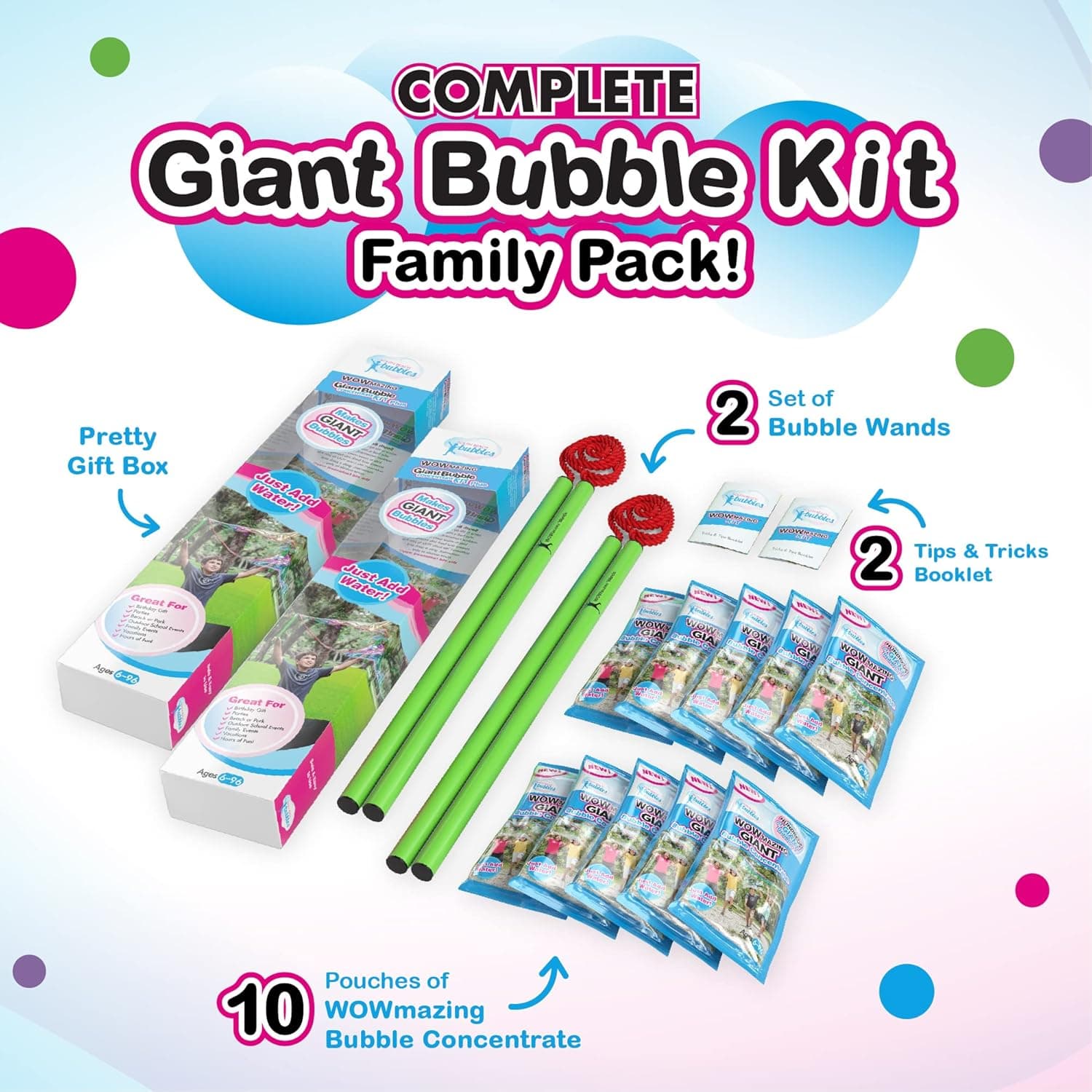SOUTH BEACH BUBBLES = OUTDOOR. FAMILY. FUN. Our USA-based company came to life by two devoted fathers who had a mission to start an outdoor movement, by encouraging kids to move away from the screens & back into having fun outdoors!! WOWMAZING: #1 LEADER IN GIANT BUBBLES Here is the perfect introduction to the world of ginormous, colorful, high-flying, long-lasting bubbles! Once the first huge bubble takes shape, you’ll hear people shout, “Wow!” and “Amazing!” – you’ll understand why we call them “WOWmazing!” BUBBLE SOLUTION IS PROUDLY MADE IN THE USA! Our Giant Bubble solution is proudly made in the USA. It is safe, environmentally friendly, & non-toxic! We focus on quality & you can trust you're getting a premium, reliable, and superior product. DESIGNED FOR THE ENTIRE FAMILY: AGES 6-96 Our unique giant bubble products are a must-have entertainment for a day at the beach or park, toddler or Grandpa’s birthday party, company’ spring celebration, preschool fundraiser event, resort, summer & winter camp activity, or your next family vacation. WHAT YOU’LL GET ✔ A set of wands that has the same design used to set every “Biggest Bubble” world record, for the last 30 years! ✔ 2 pouches of “We had so much fun!” Each pouch mixes with a quart of water and makes hundreds of the biggest, most beautiful bubbles ever. ✔ A bag that converts into a bucket, a true Grab-N-Gp set! ✔ A terrific “Tips and Tricks” booklet, to help the whole family becomes master bubble creators! SUPPORT AUTISM AWARENESS This new product design can help develop kids’ motor skills by engaging in healthy outdoor activities and a portion of this product's proceeds goes to support autism research and awareness.